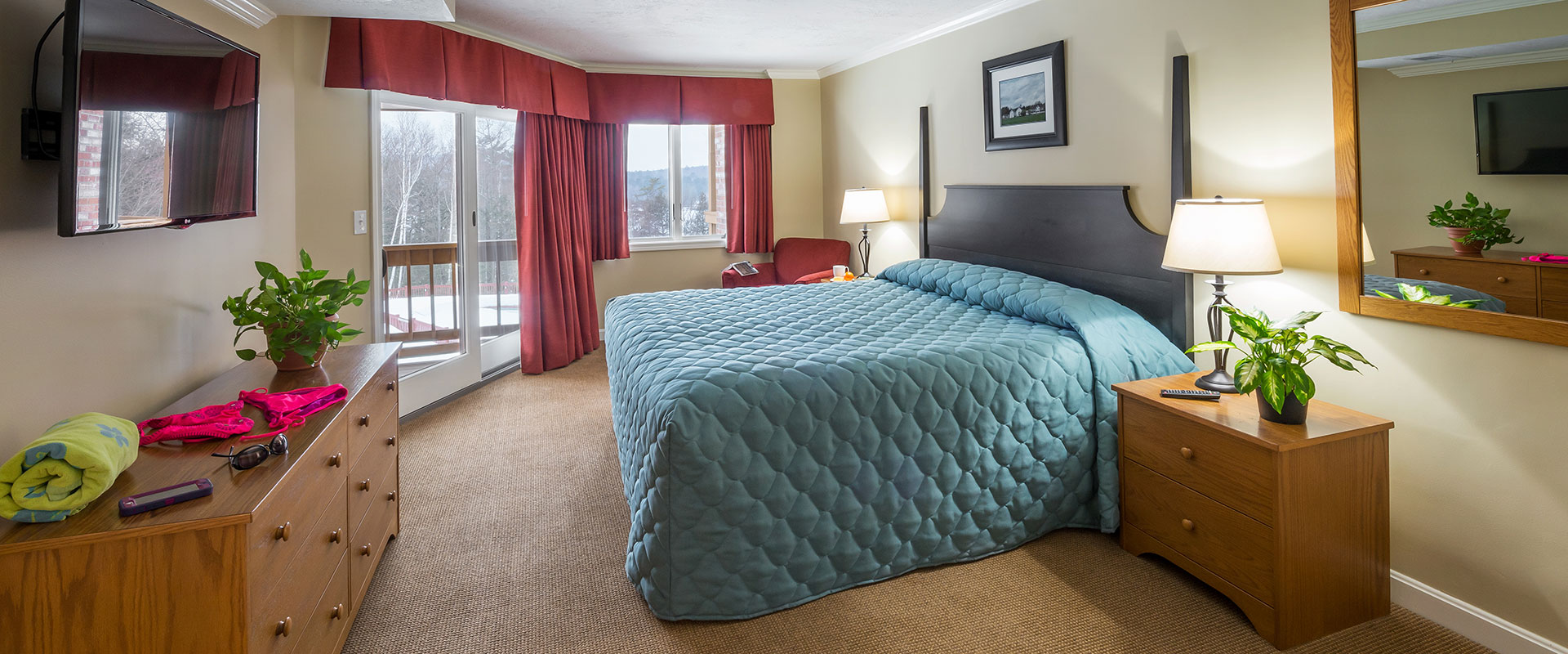 Relax in the master bedroom of our Deluxe Suite with private bath & patio or deck